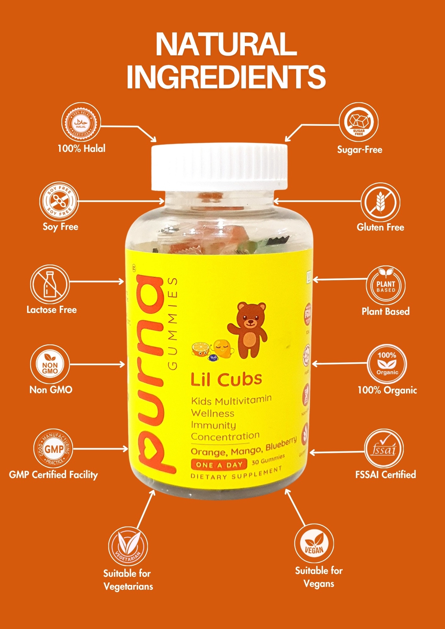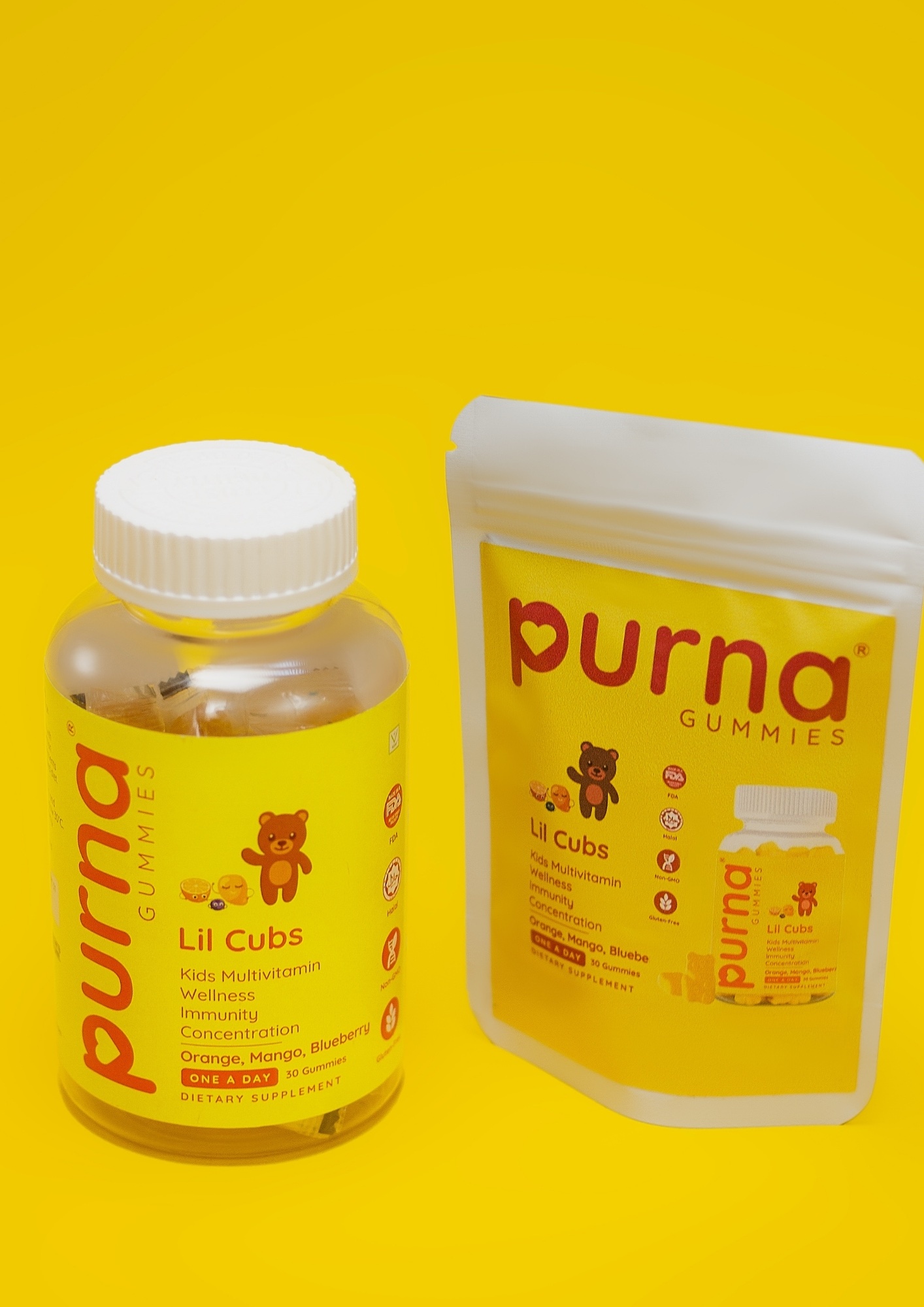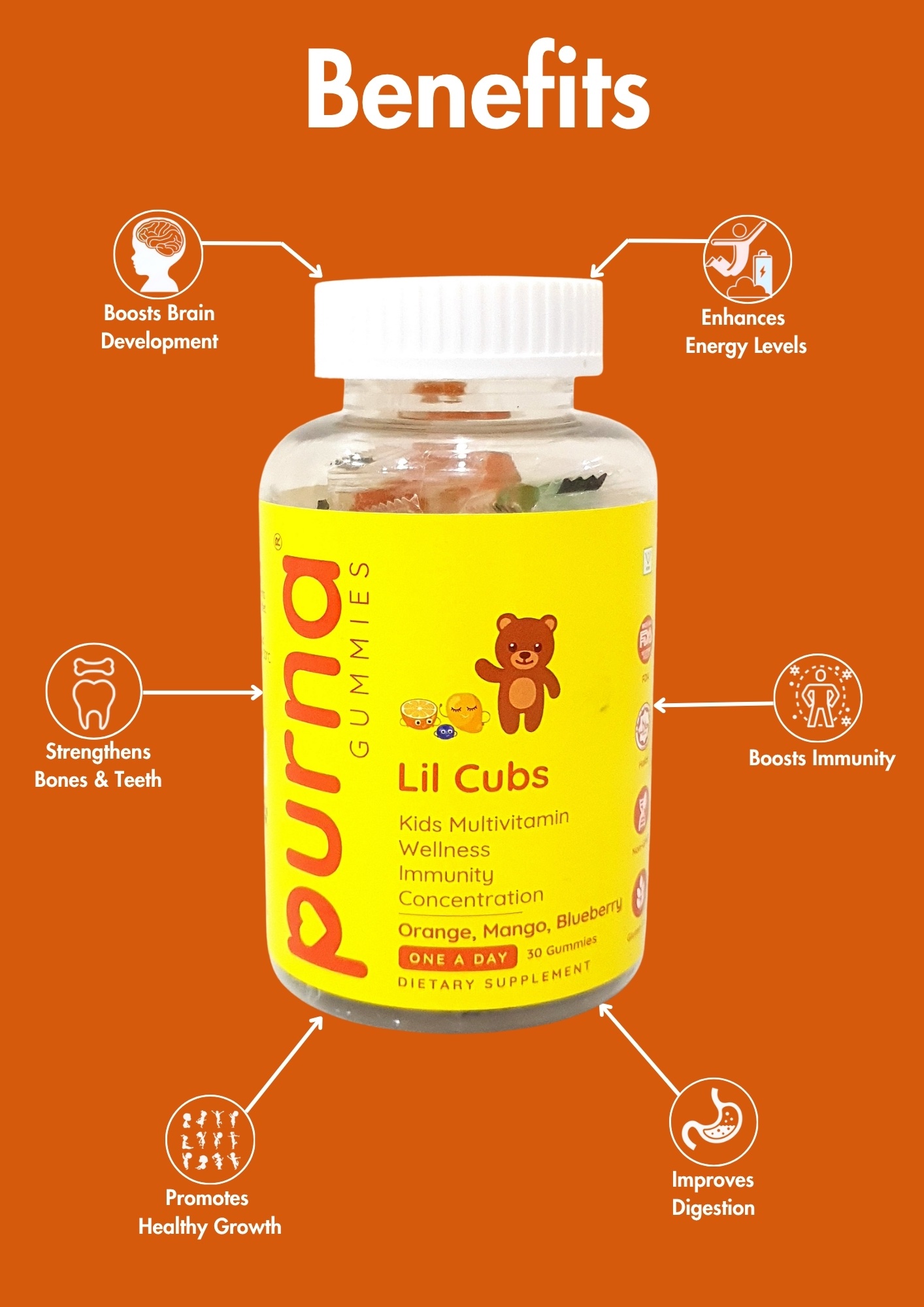Packed with key vitamins and minerals, Purna Lil Cubs Gummies support children’s growth, brain function, and immune defense — all in a fun, fruity gummy kids love.